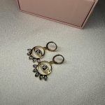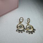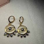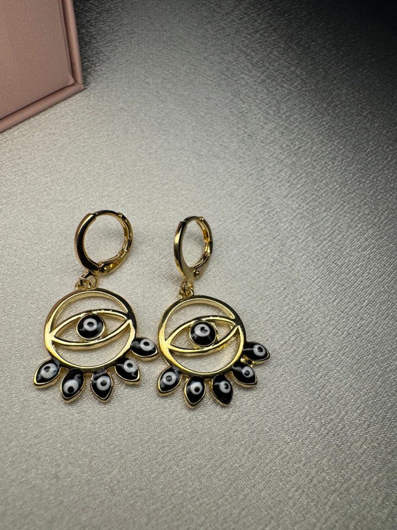 Siyah nazar motifleriyle süslenmiş, altın renkli sallantılı göz küpe modeli.