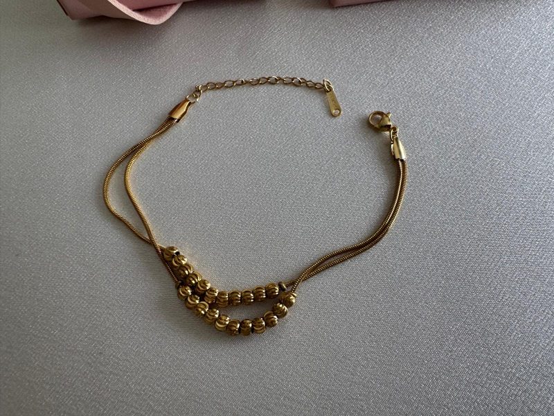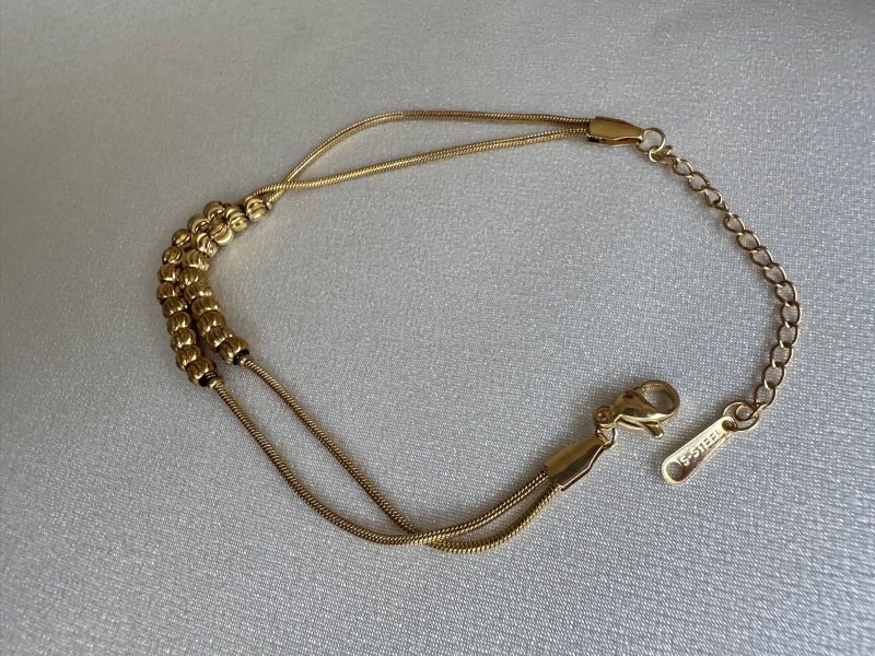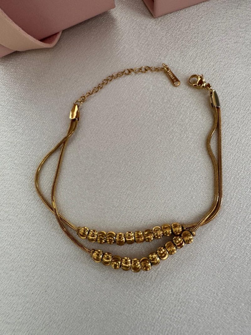 Altın rengi, çift kat zincir ve boncuk dizilimli paslanmaz çelik bileklik.