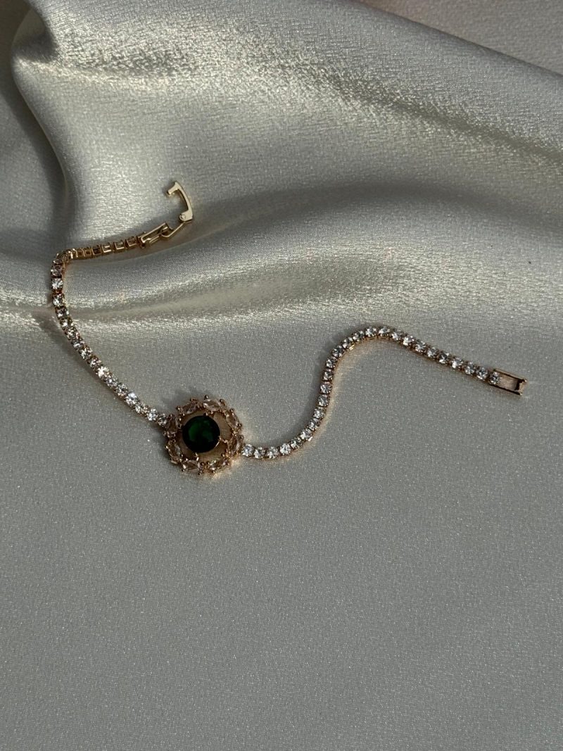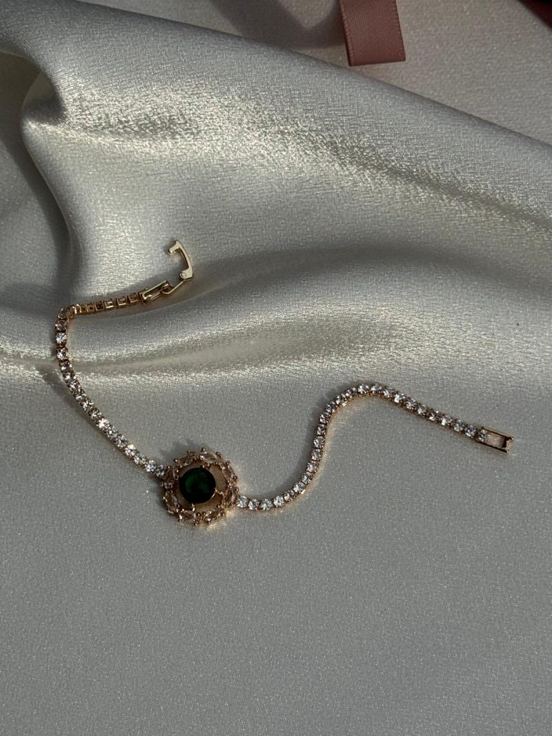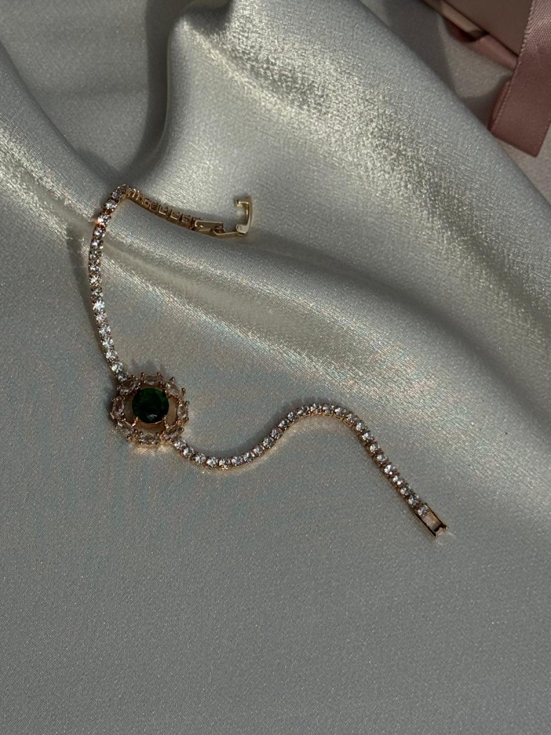Yeşil taş detaylı, taşlı zincirli özel gün bilekliği. Göz alıcı ve sofistike.
