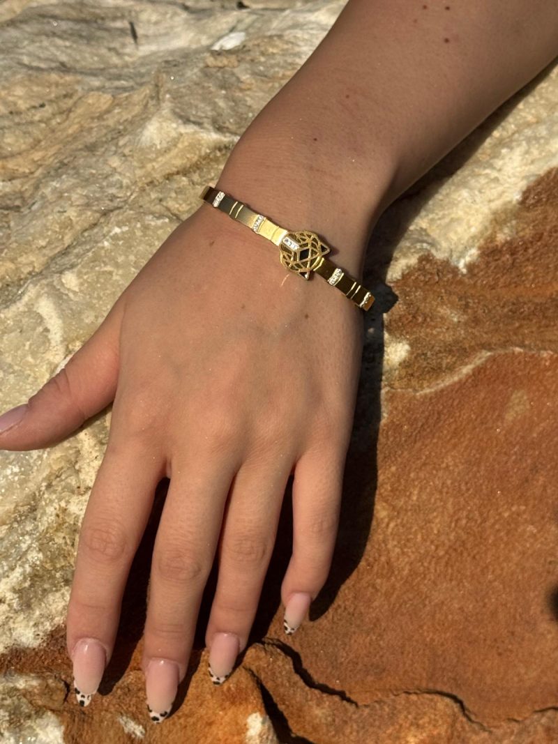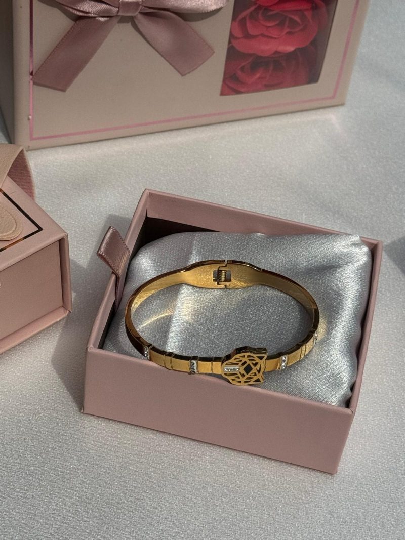 Bu altın renkli paslanmaz çelik kelepçe bileklik, merkezindeki zarif geometrik formda taş detay ve yanlarındaki mini taş süslemeler ile dikkat çekiyor. Şık, sade ve asil bir duruş sergileyen bu tasarım; günlük kullanımda minimal ama etkili bir dokunuş, özel günlerde ise sofistike bir tamamlayıcıdır. Suya ve parfüme karşı dayanıklıdır, kararma yapmaz. Tokalı yapısıyla bileğe tam oturur ve güvenle kullanılabilir.