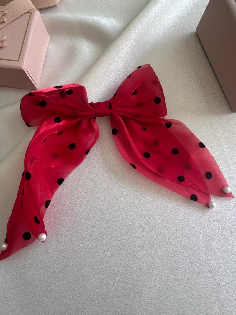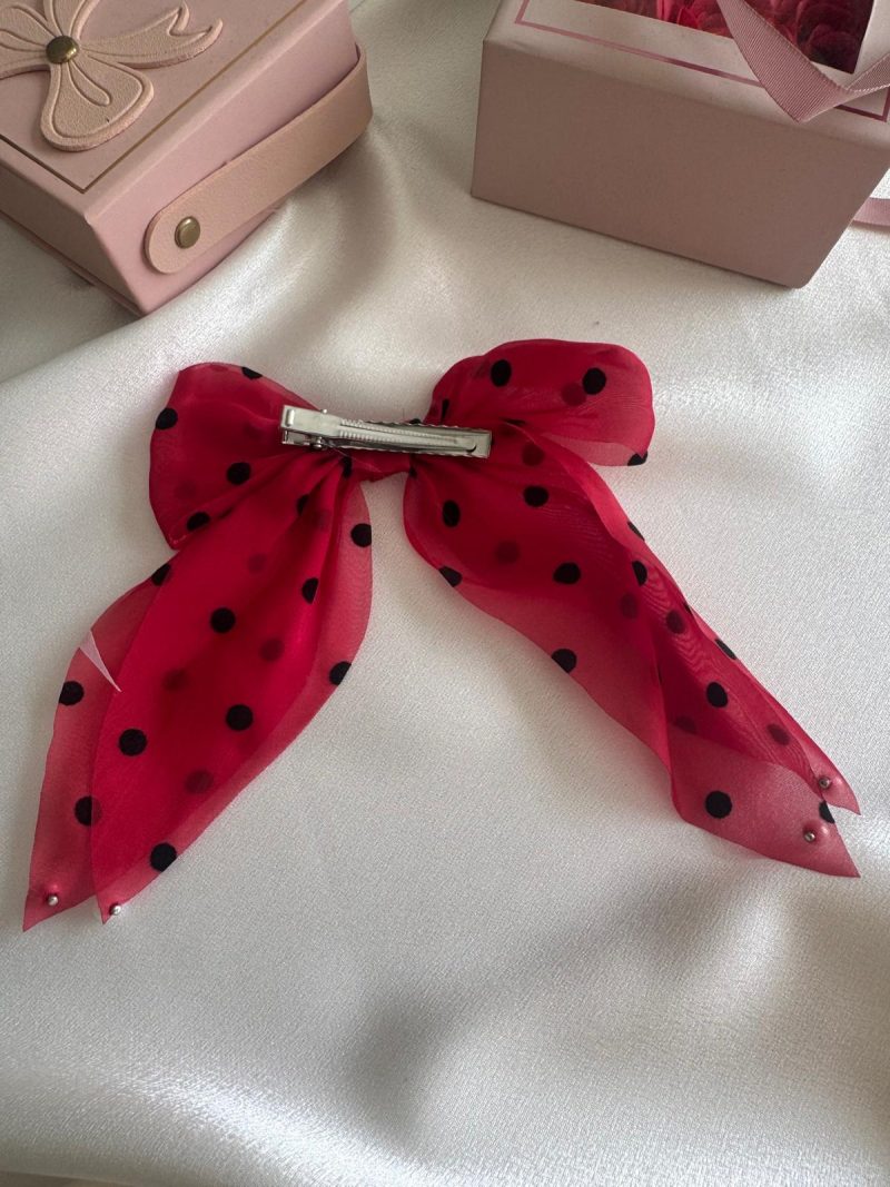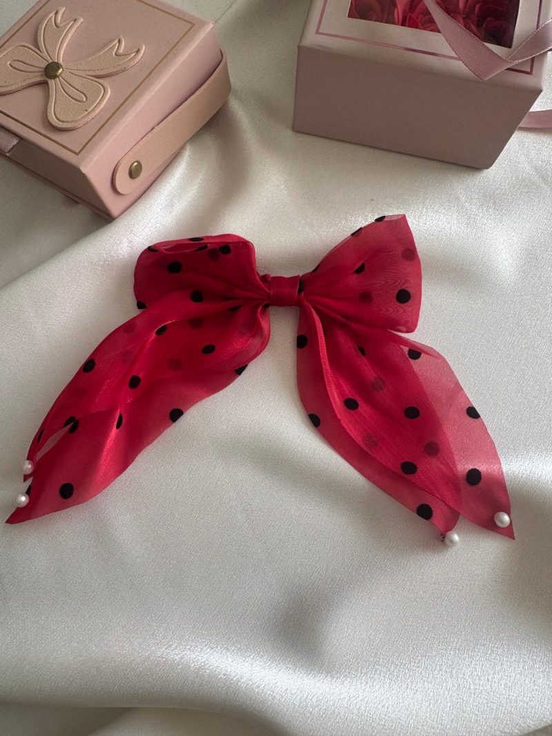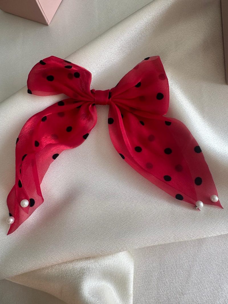Canlı kırmızı rengi, puantiye deseni ve inci detaylarıyla saçlarınıza enerjik ve şık bir dokunuş katın.