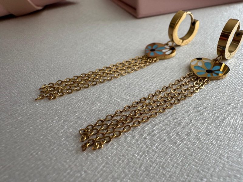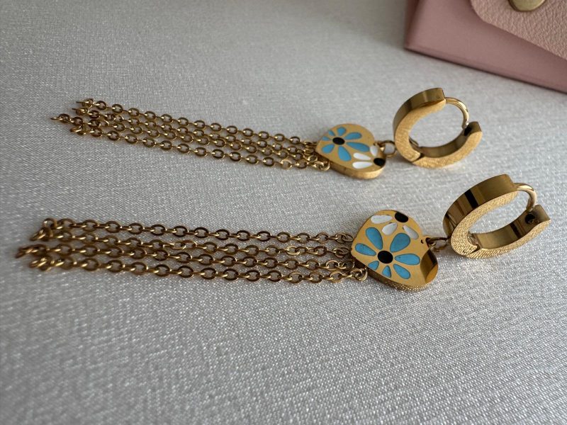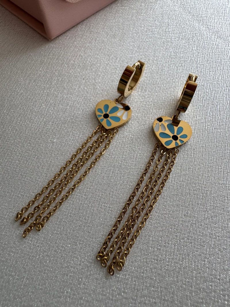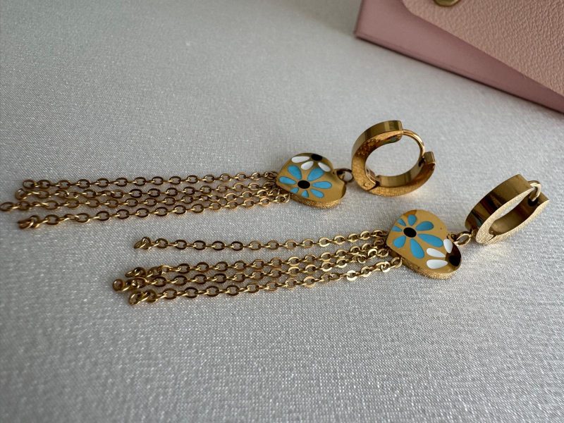Paslanmaz çelikten üretilmiş bu zarif küpe, altın tonlu kalp formu üzerine yerleştirilmiş mavi, beyaz ve siyah tonlarında papatya desenleriyle canlı bir görünüm sunuyor. Uzun zincir detayı ise hareketli ve zarif bir duruş kazandırıyor.