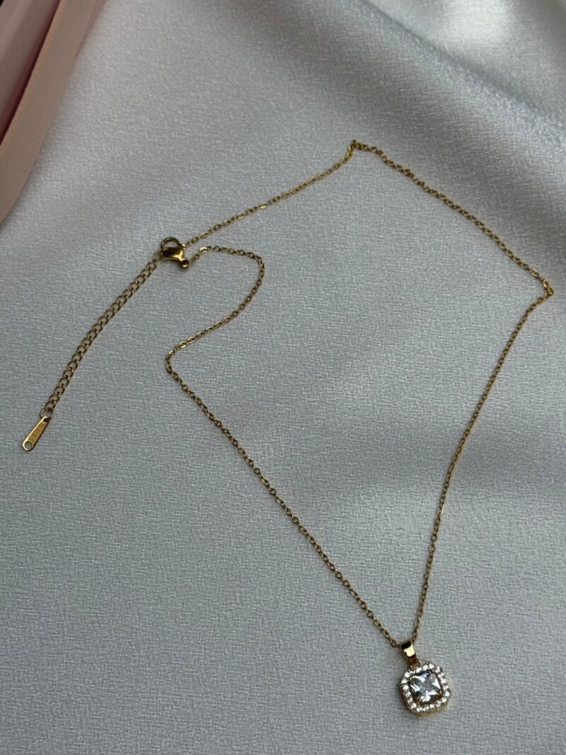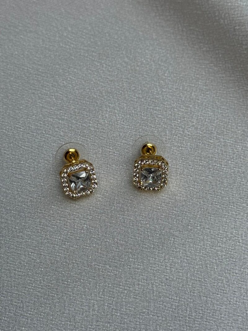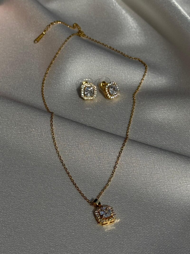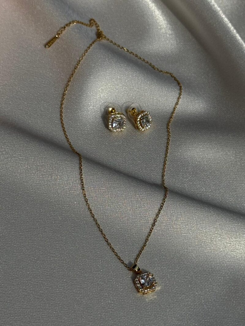 Kare kesim parlak taşlarla tasarlanmış, altın kaplama paslanmaz çelik kolye ve küpe seti.