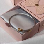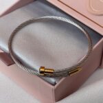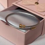 Gümüş tonlu çelik halat tasarım, altın kaplama uç detaylı minimal paslanmaz çelik bileklik.