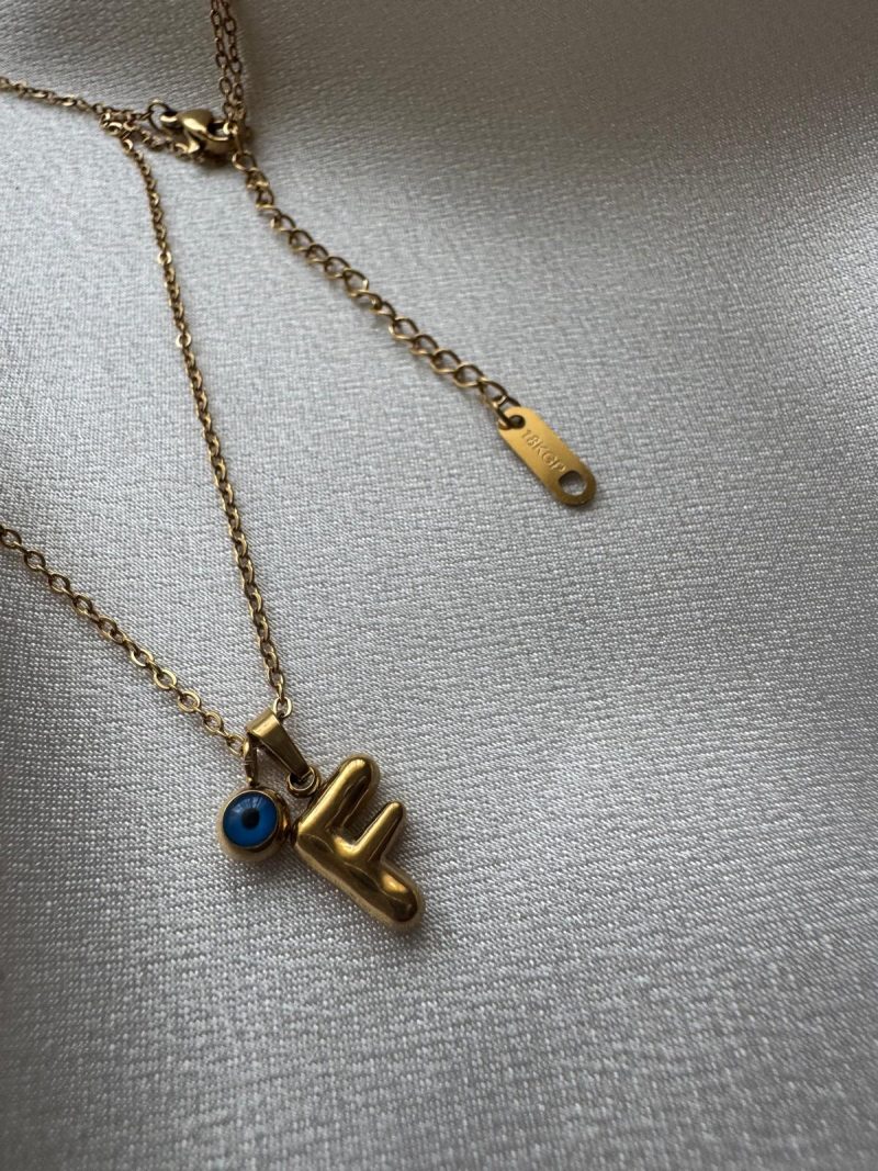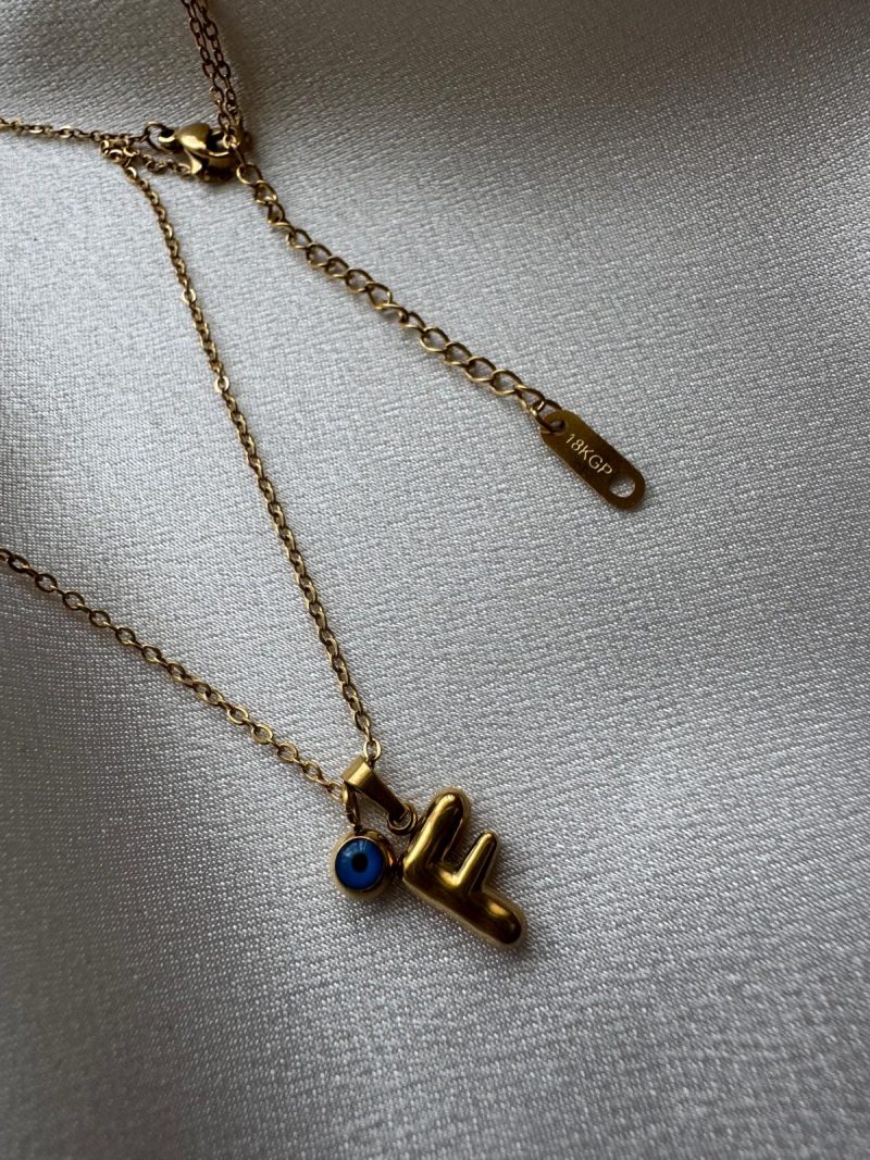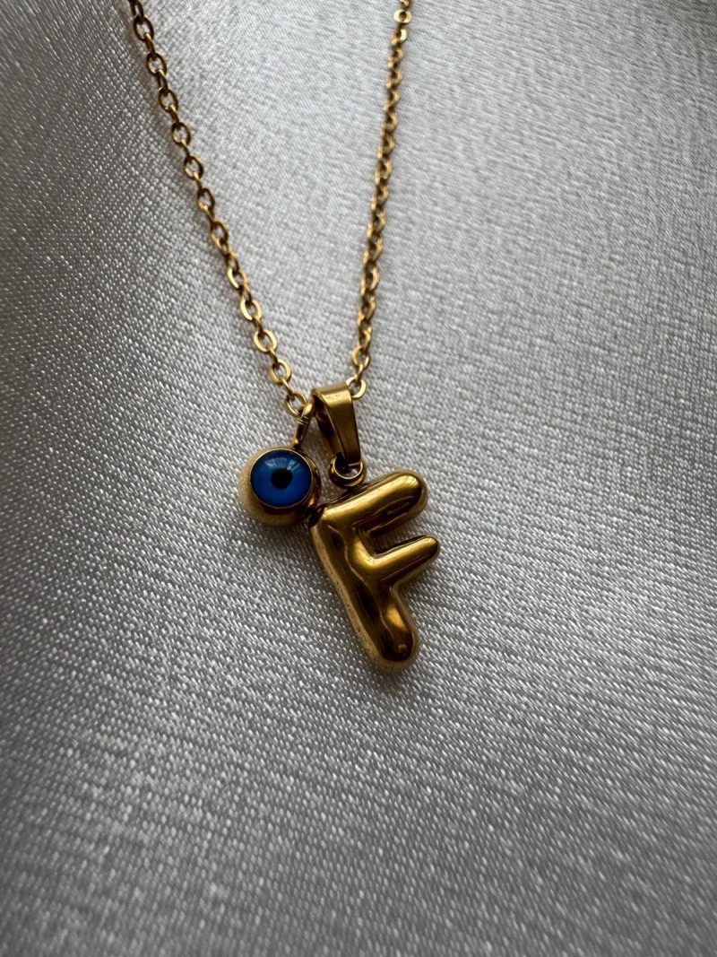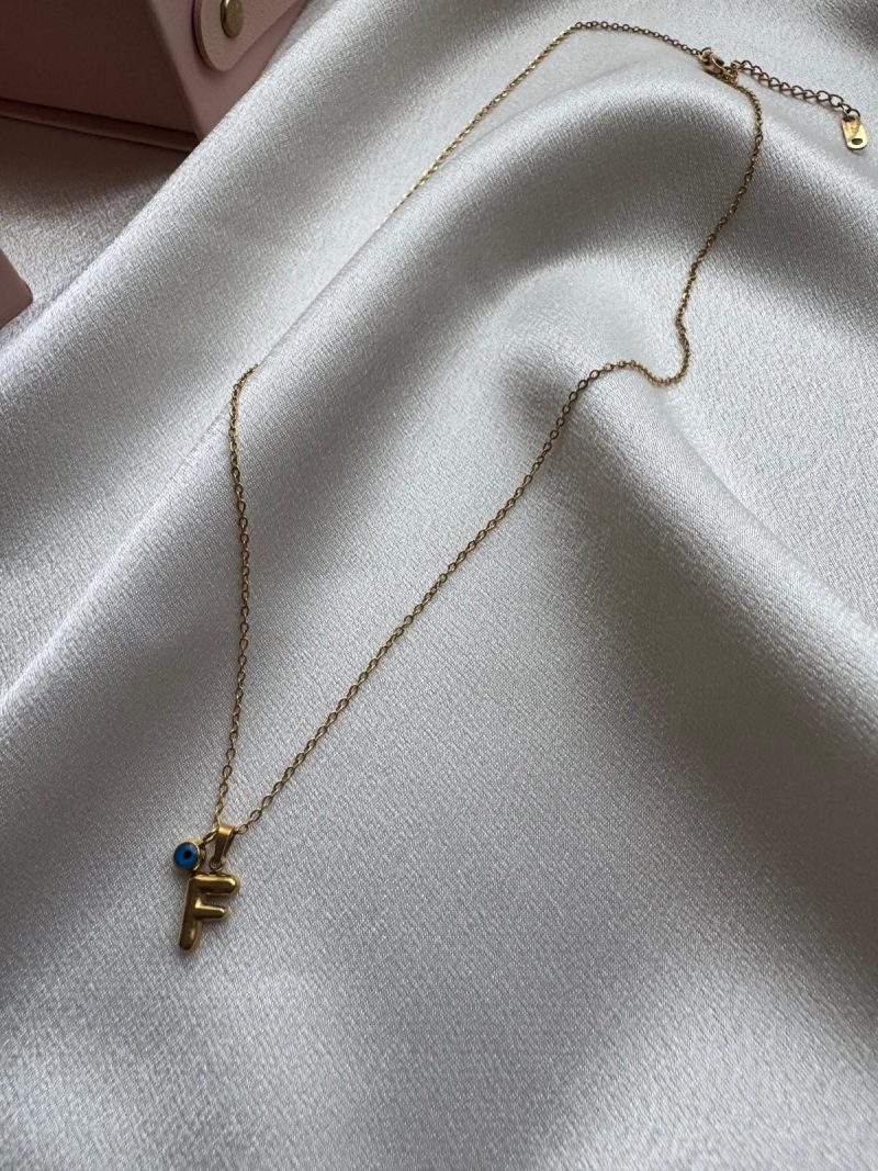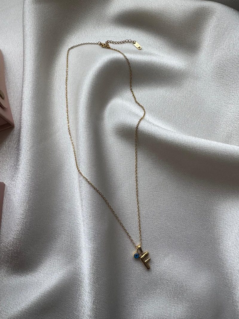 Altın kaplama paslanmaz çelikten, minimal ‘F’ harfli ve nazar boncuklu zarif kolye.
