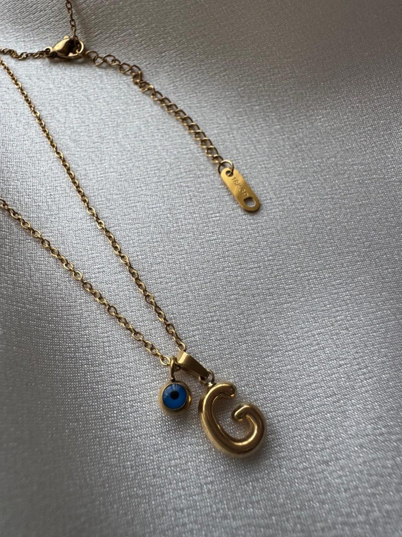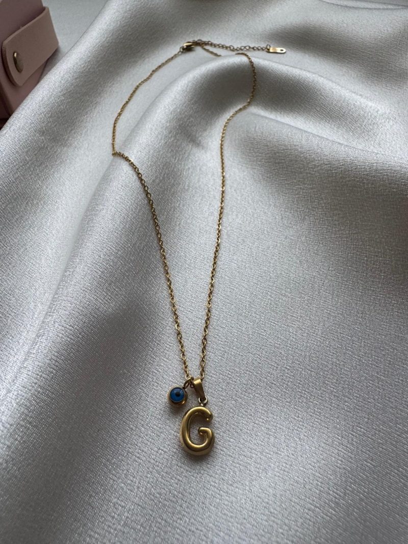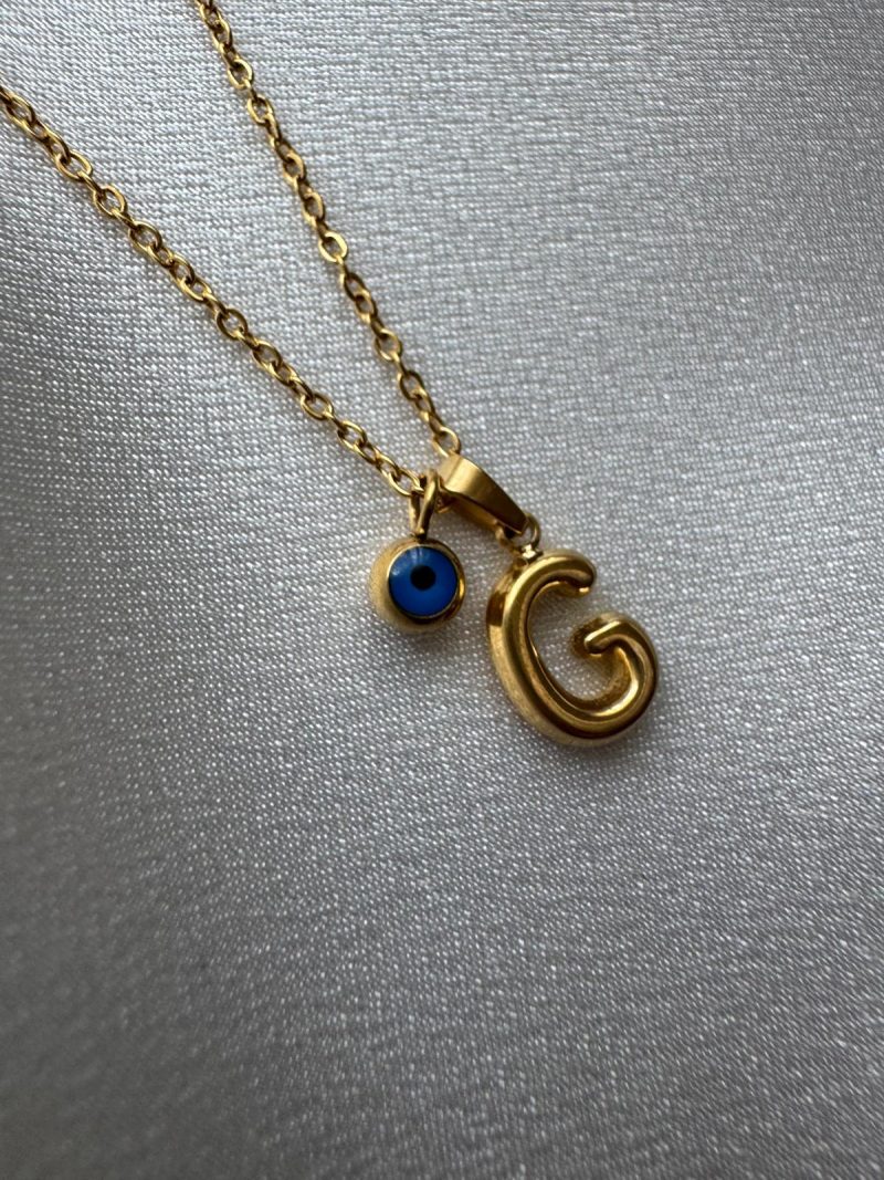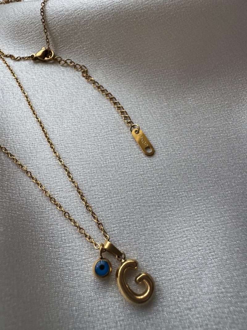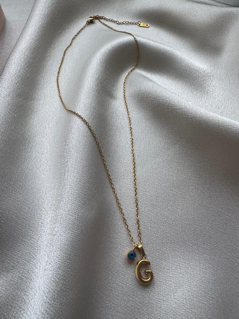 Altın kaplama, paslanmaz çelikten minimal ‘G’ harfi ve nazar boncuğu detaylı kolye.