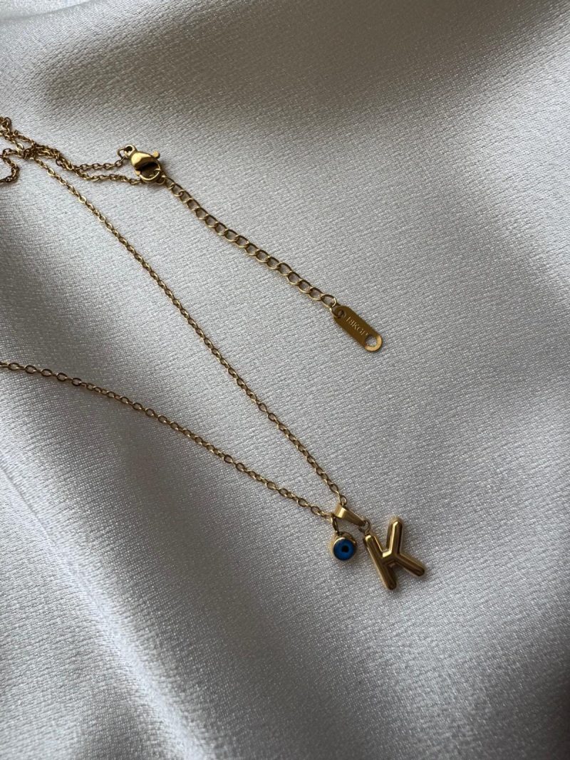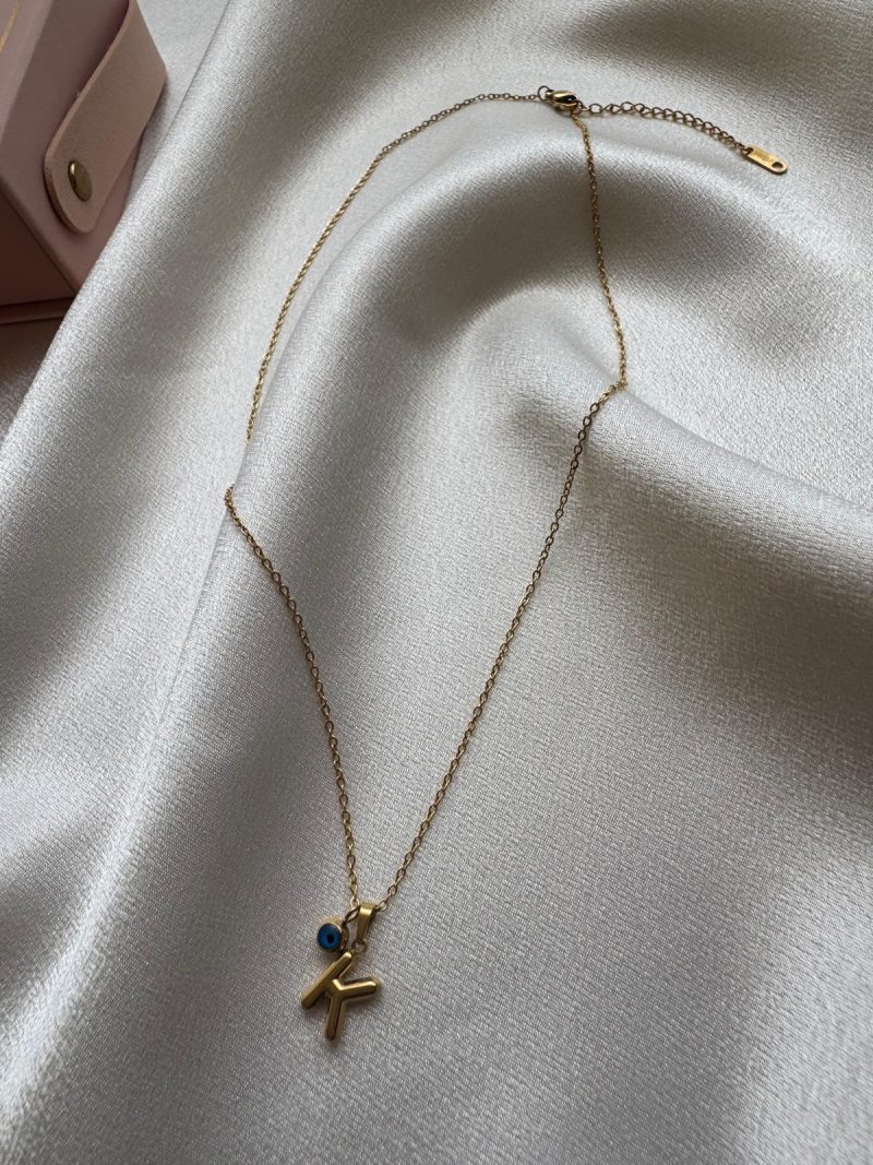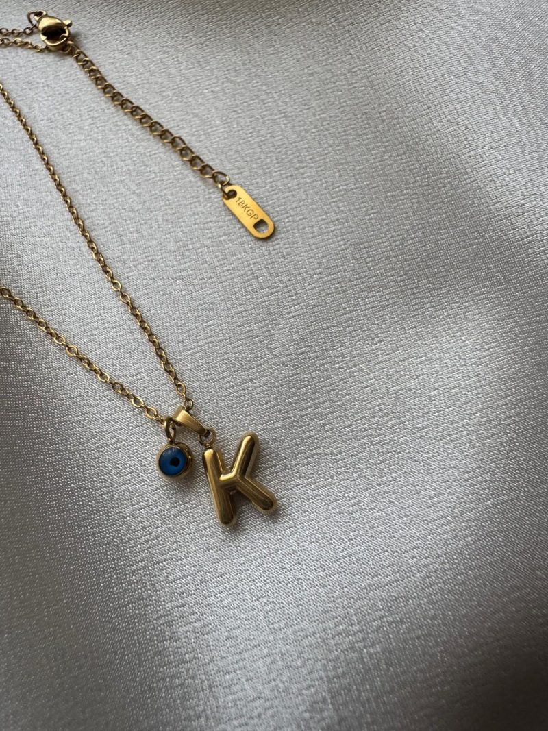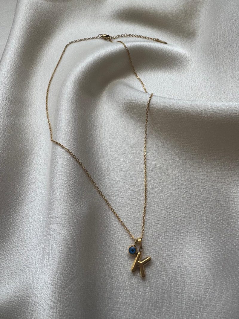 Altın kaplama paslanmaz çelikten, nazar boncuklu ve ‘K’ harfli minimal kolye modeli.