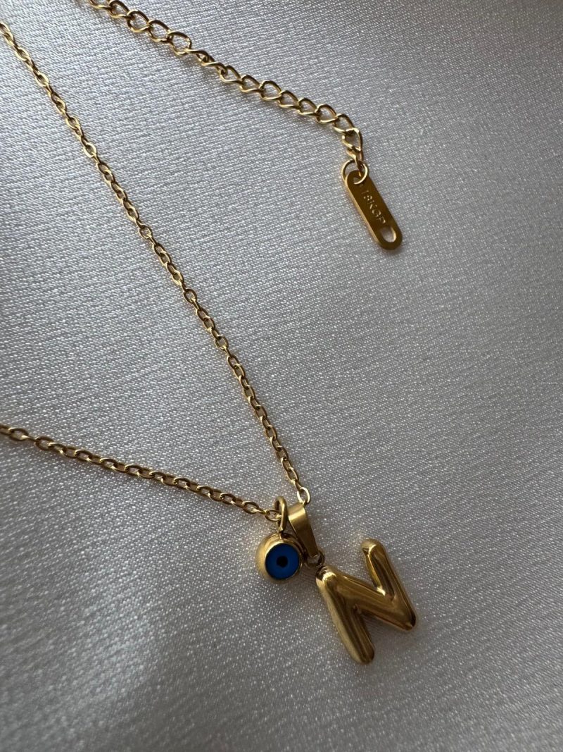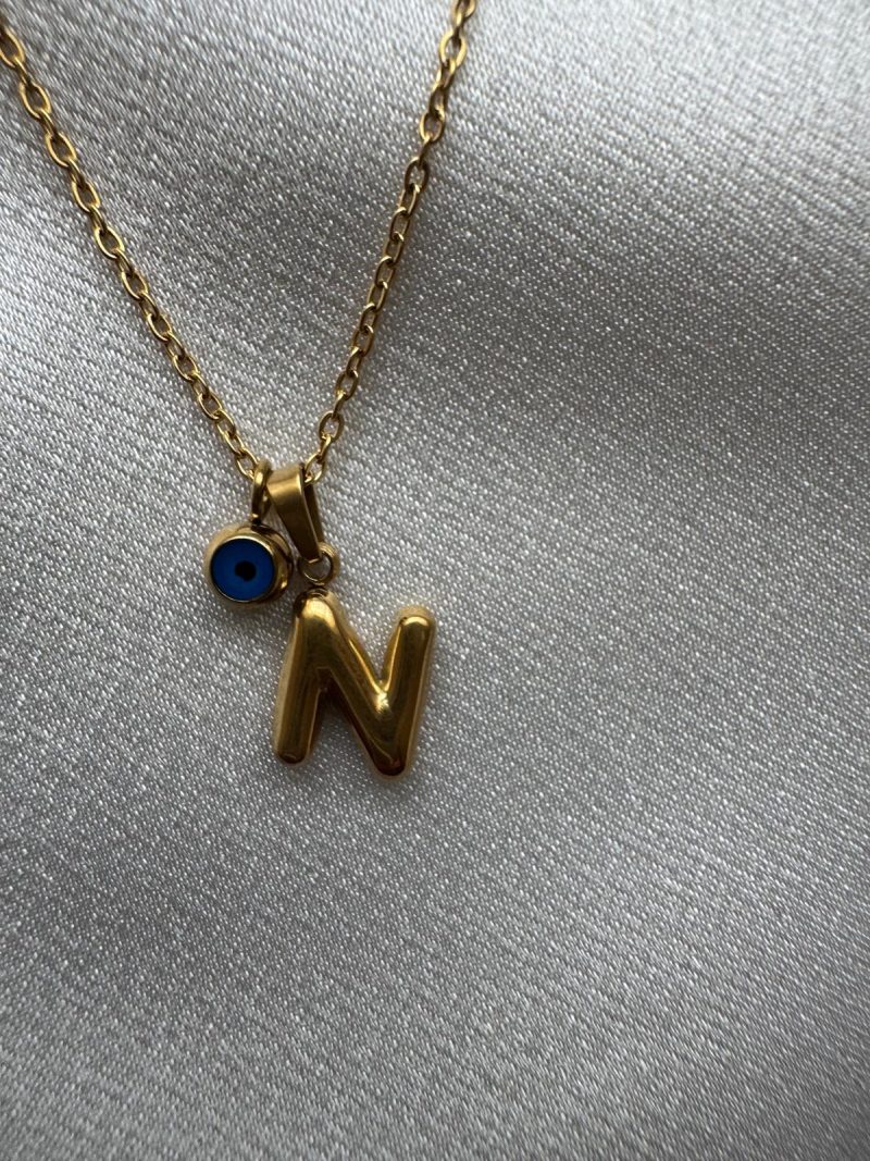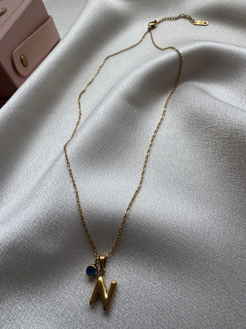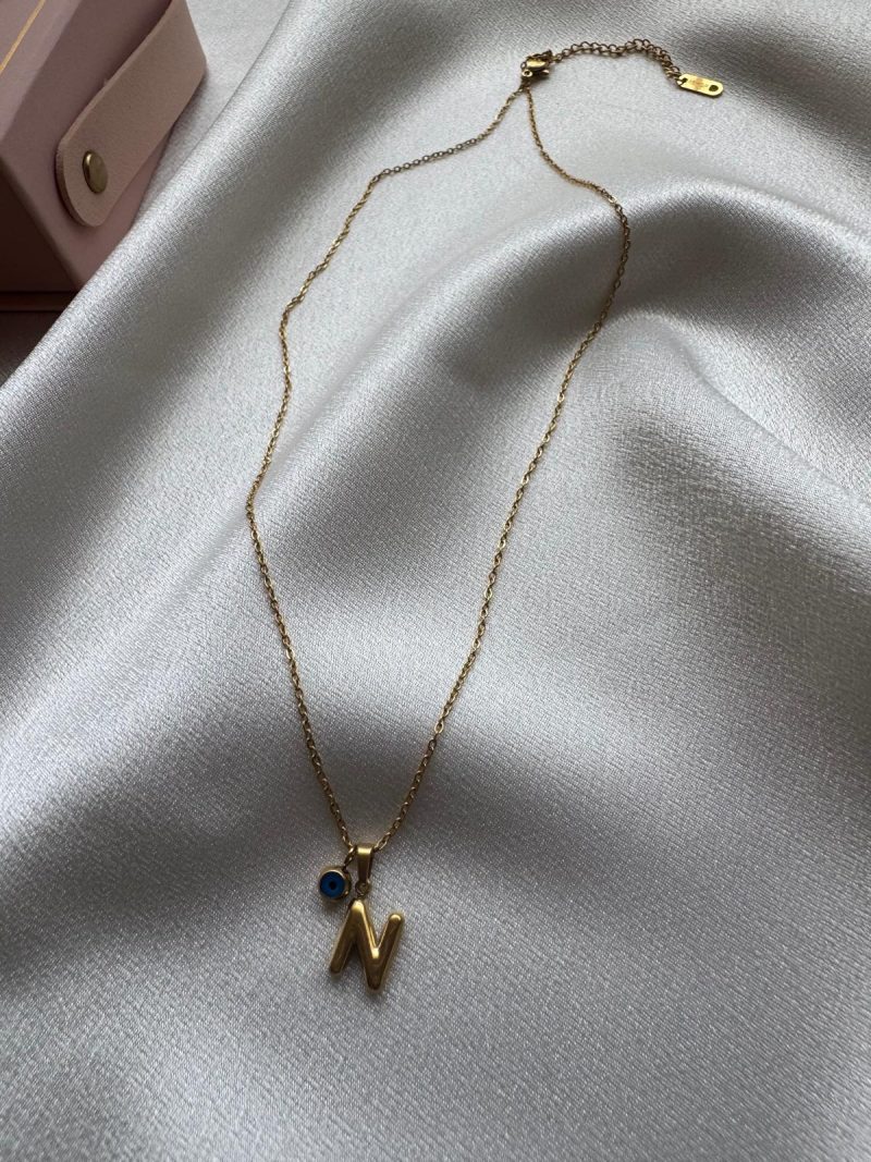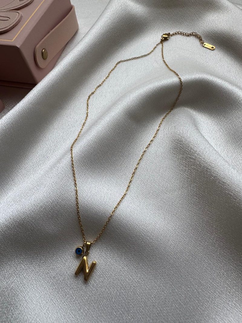 Paslanmaz çelikten üretilmiş, minimal ‘N’ harfi ve nazar boncuğu detaylı zarif kolye.