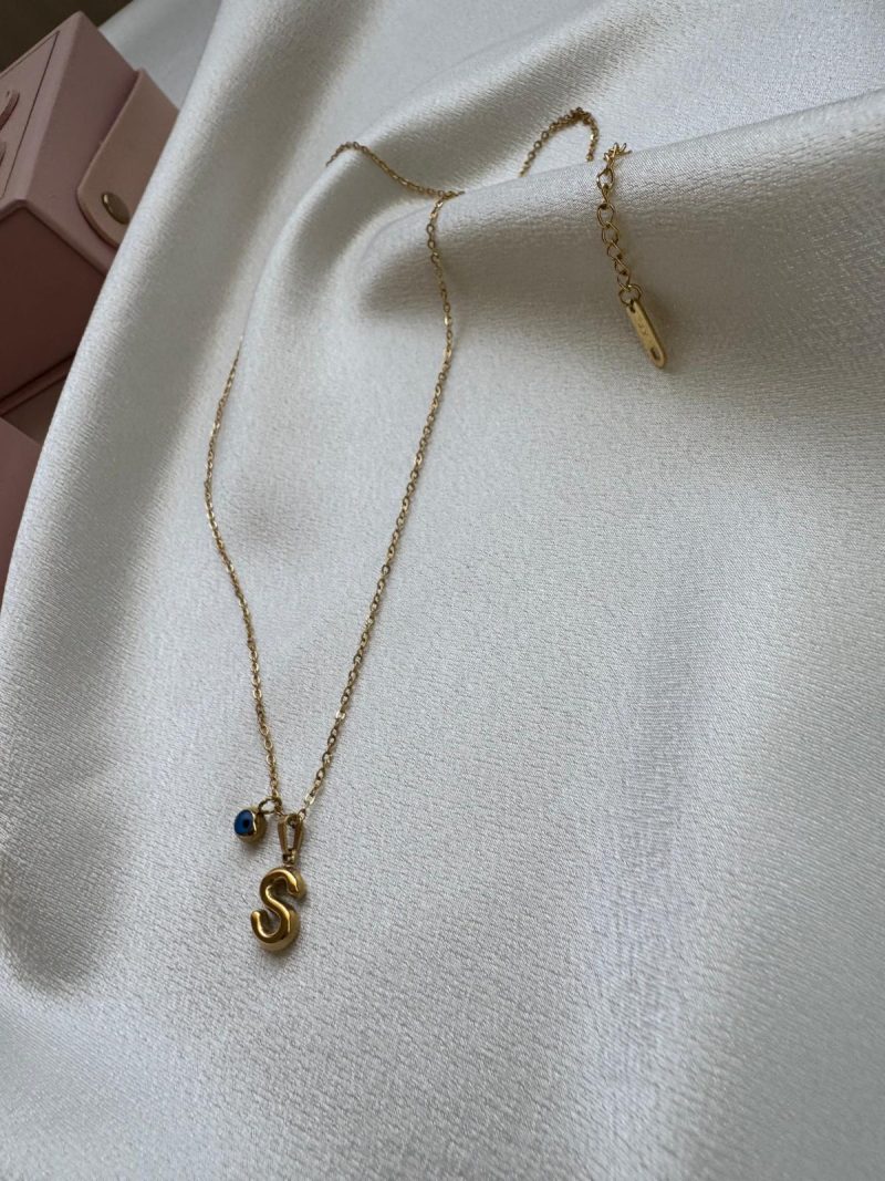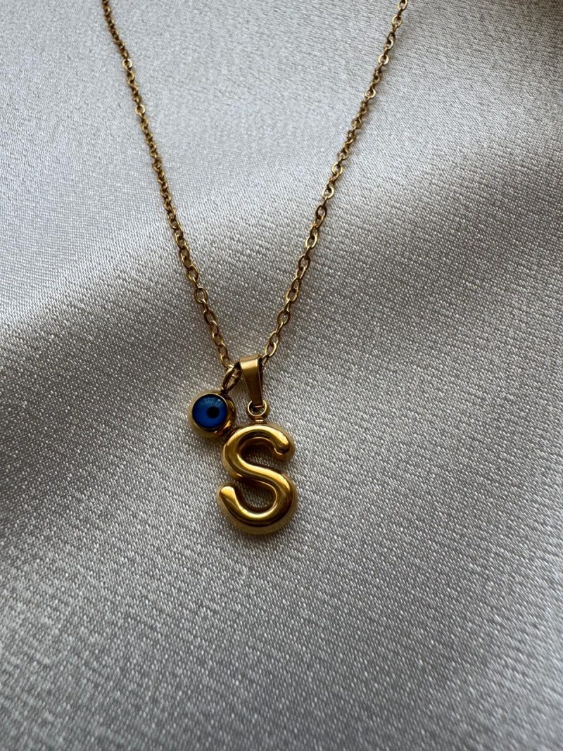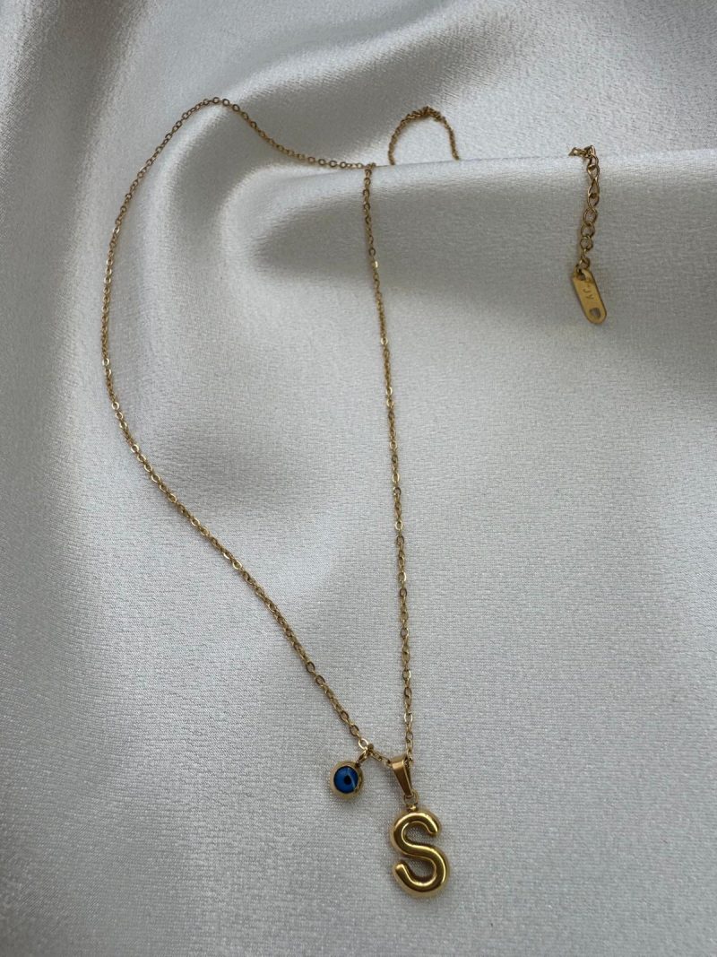Altın kaplama paslanmaz çelikten yapılmış, minimal ‘S’ harfi ve nazar boncuğu detaylı zarif kolye.