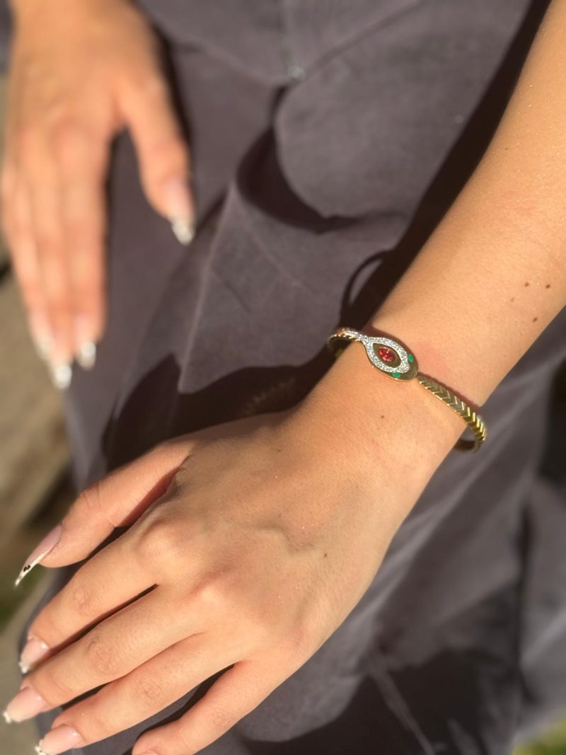 “Mystic Drop”, sadeliğin içinde saklı bir hikâyeyi bileğinizde taşımanızı sağlar. Damla formuna işlenmiş zümrüt yeşili, yakut kırmızısı ve kristal parlaklıkta taşlar; doğadan ilham alan bir dengeyi simgeler. Altın tonlu paslanmaz çelik yüzey ise zamana meydan okurcasına kalıcı bir şıklık sunar. Geometrik kesim detayları ve ışıltılı taşların birleşimiyle hem mistik bir hava taşır hem de modern tarzlara kolayca uyum sağlar.