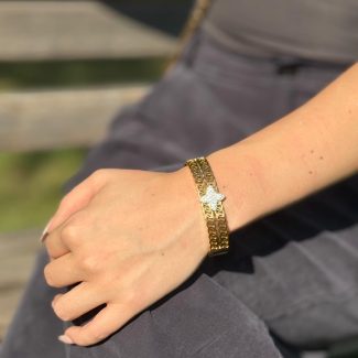 Modern hatlar, altın ışıltısı ve taş zarafeti bir arada: özel tasarım paslanmaz çelik bileklik.