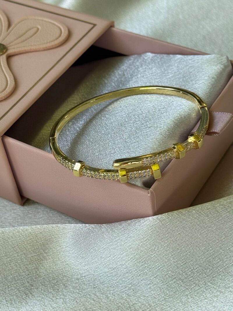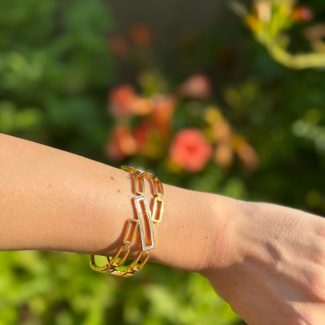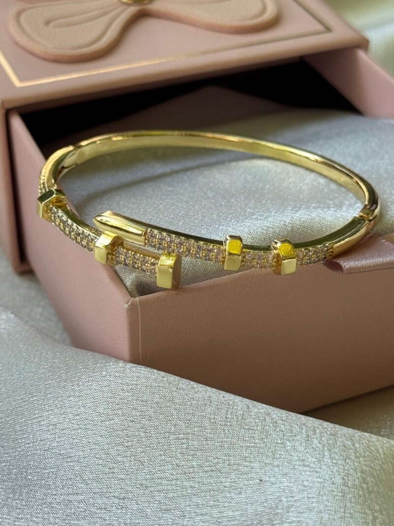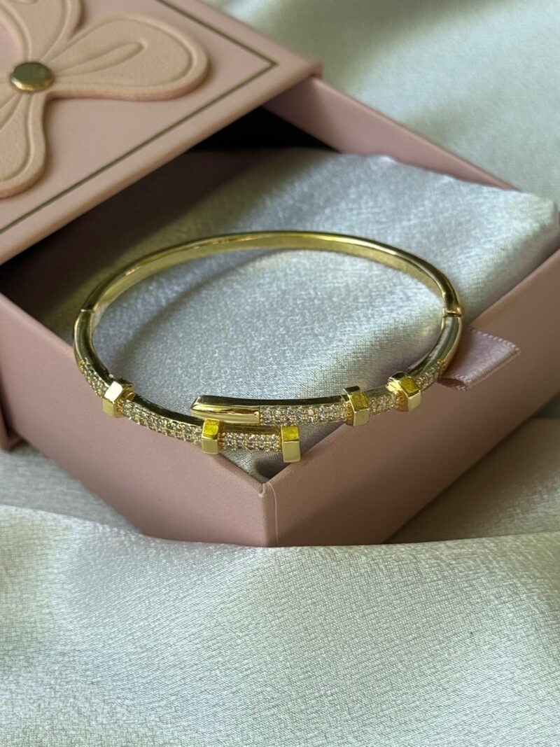 Modern tasarımın en şık yansıması… Altın kaplama ve geometrik taş detaylarıyla göz alıcı bir görünüme sahip bu özel tasarım bileklik, paslanmaz çelik yapısıyla uzun yıllar parlaklığını korur. Hem günlük şıklıkta hem de özel davetlerde fark yaratan bu model, sofistike tarzını ön plana çıkarmak isteyenler için mükemmel bir seçimdir. Alerji yapmayan yapısıyla cildinizle dosttur.