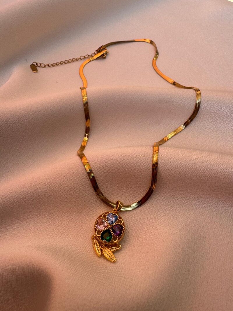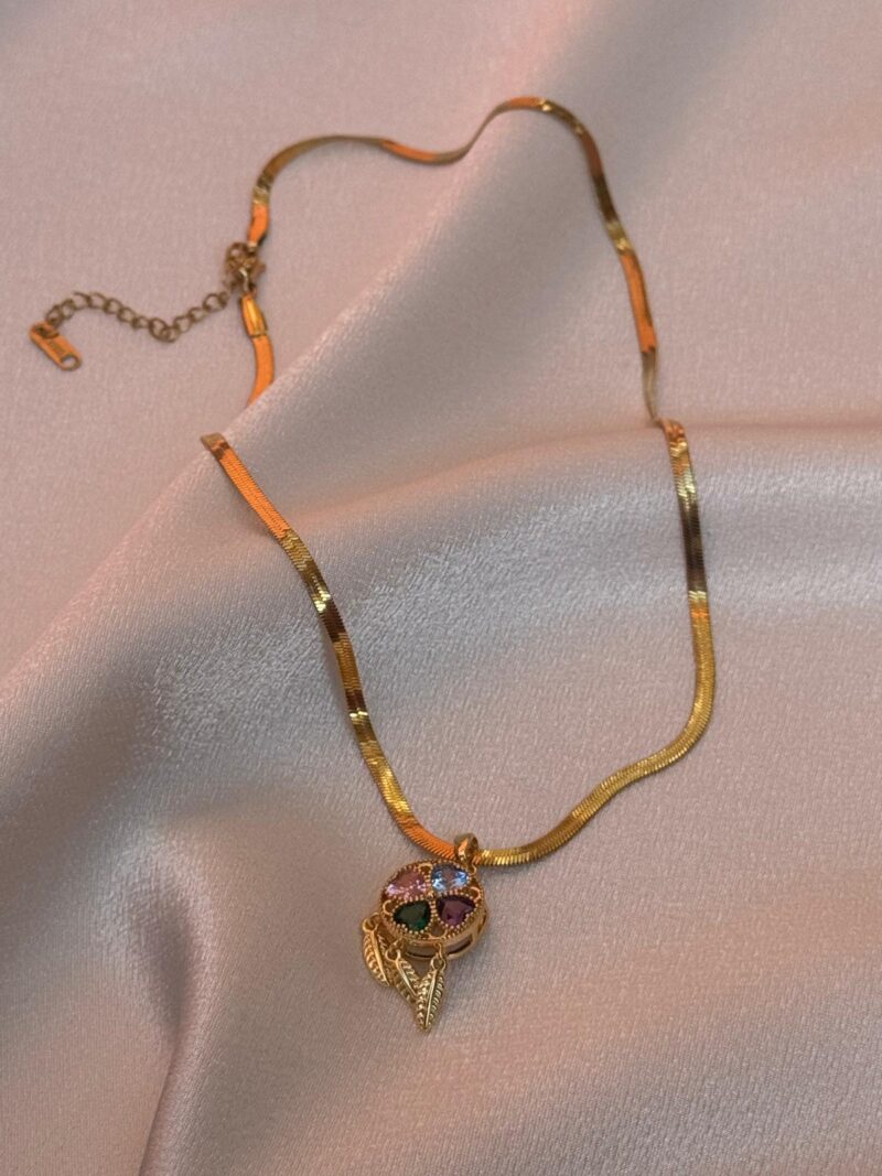 Renkli Taşlı Çiçek Motifli Altın Kaplama Kolye – Paslanmaz Çelik