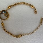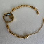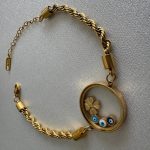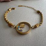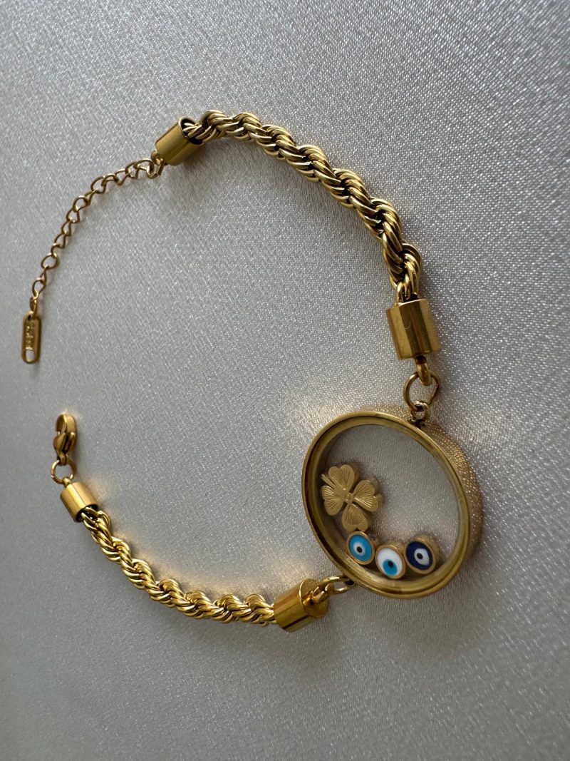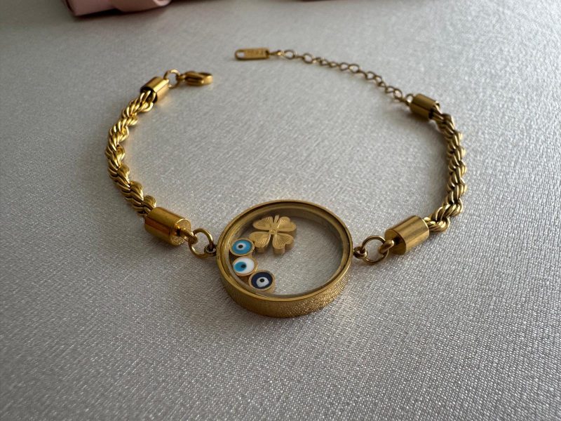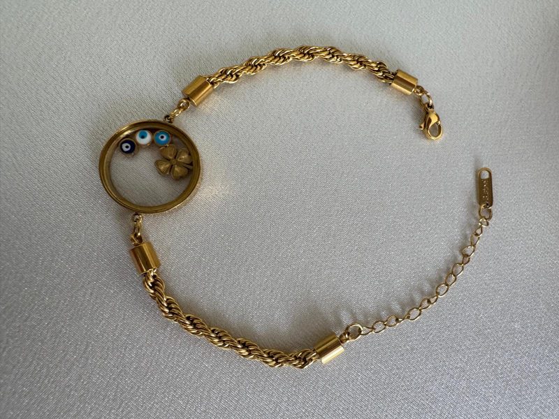 Altın rengi paslanmaz çelik bileklik; içinde nazar boncuğu ve dört yapraklı yonca detayıyla hem şık hem anlamlı.