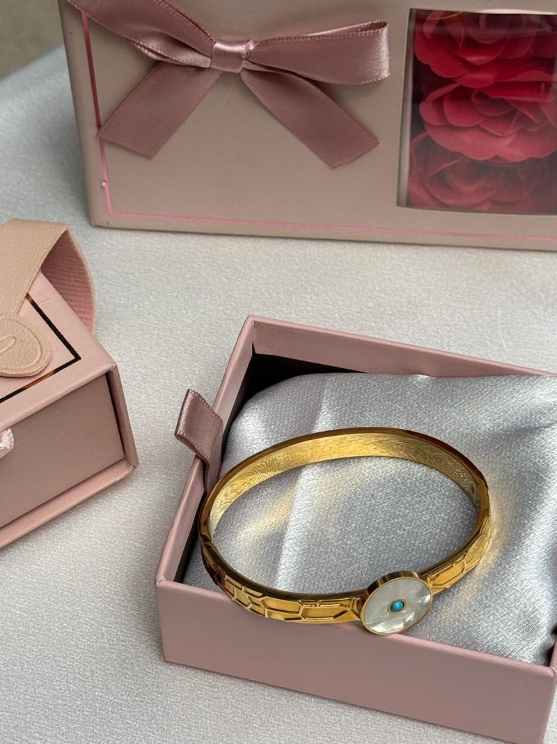 Altın rengi paslanmaz çelik kelepçe formu, kabartmalı zarif desenleri ve ortasında yer alan sedef üzerine yerleştirilmiş nazar boncuğu detayıyla bu bileklik, hem geleneksel bir anlam hem de modern bir görünüm sunuyor. Suya, parfüme ve neme karşı dayanıklıdır; uzun süre parlaklığını korur. Günlük kullanım için idealdir, ancak şık kutusuyla birlikte anlamlı bir hediye seçeneği olarak da tercih edilebilir.
