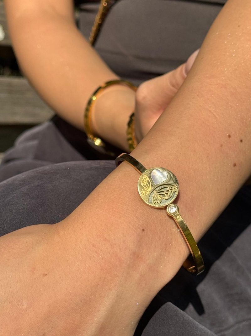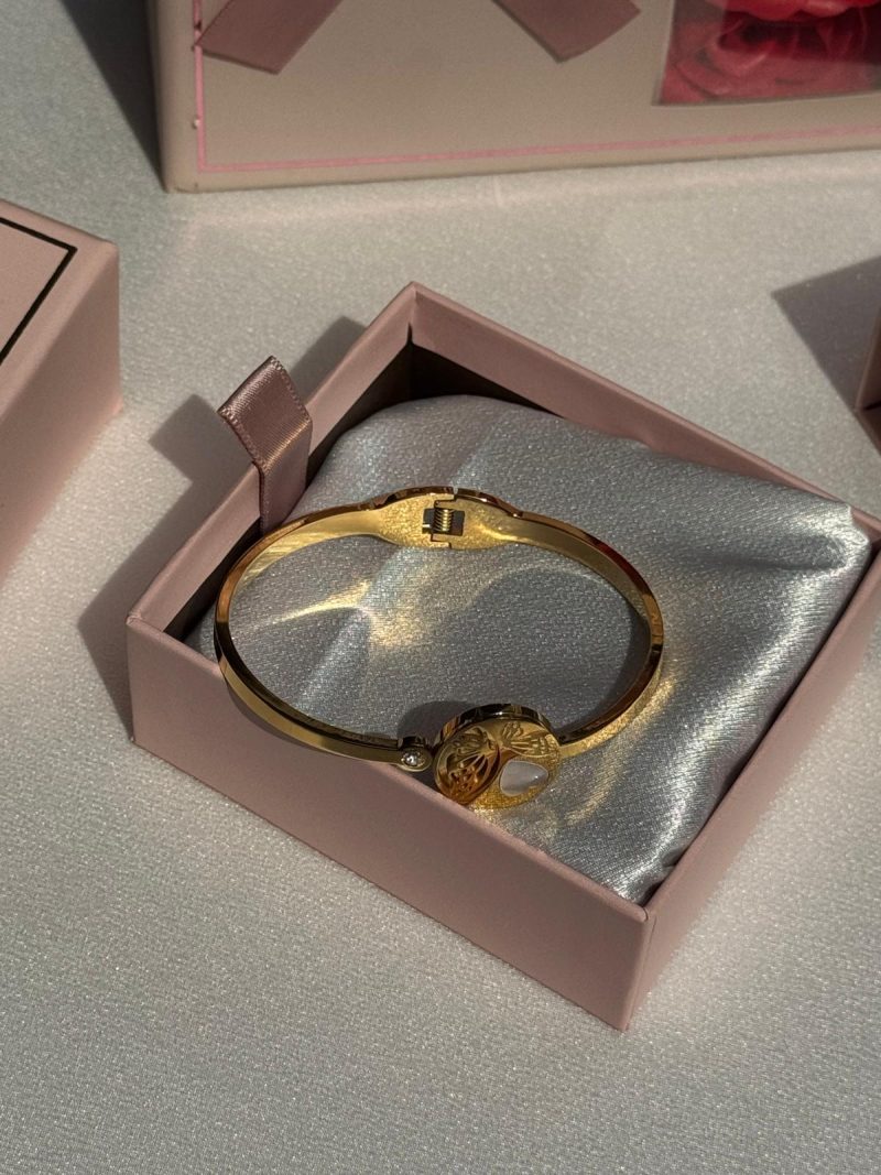Altın rengi paslanmaz çelik gövdesi ve merkezindeki sedefli yuvarlak form içinde işlenmiş zarif desenlerle öne çıkan bu kelepçe bileklik, sade şıklığın en güçlü örneklerinden biri. Taş detaylı klips bölümü ile ışığı yansıtması göz alıcıdır. Suya, parfüme ve neme karşı dayanıklı yapısıyla uzun ömürlüdür. Günlük kombinleri zarifçe tamamlar, özel günlerde ise fark yaratır.