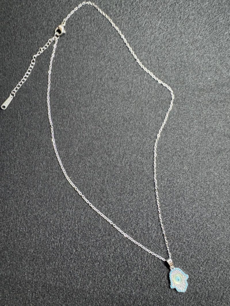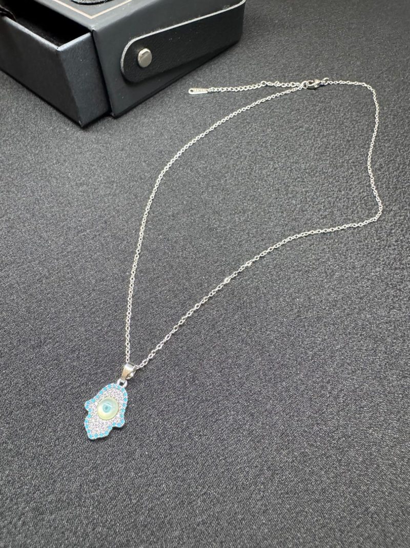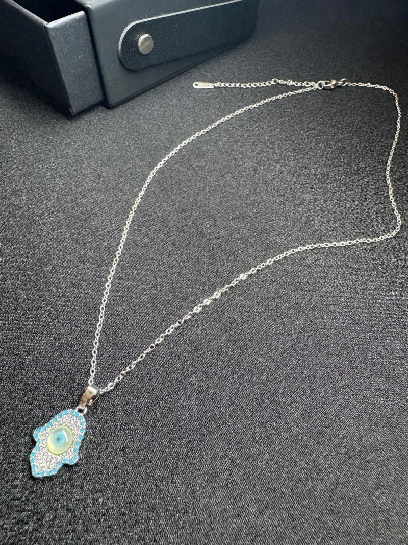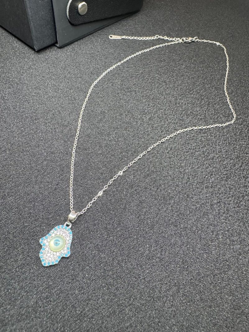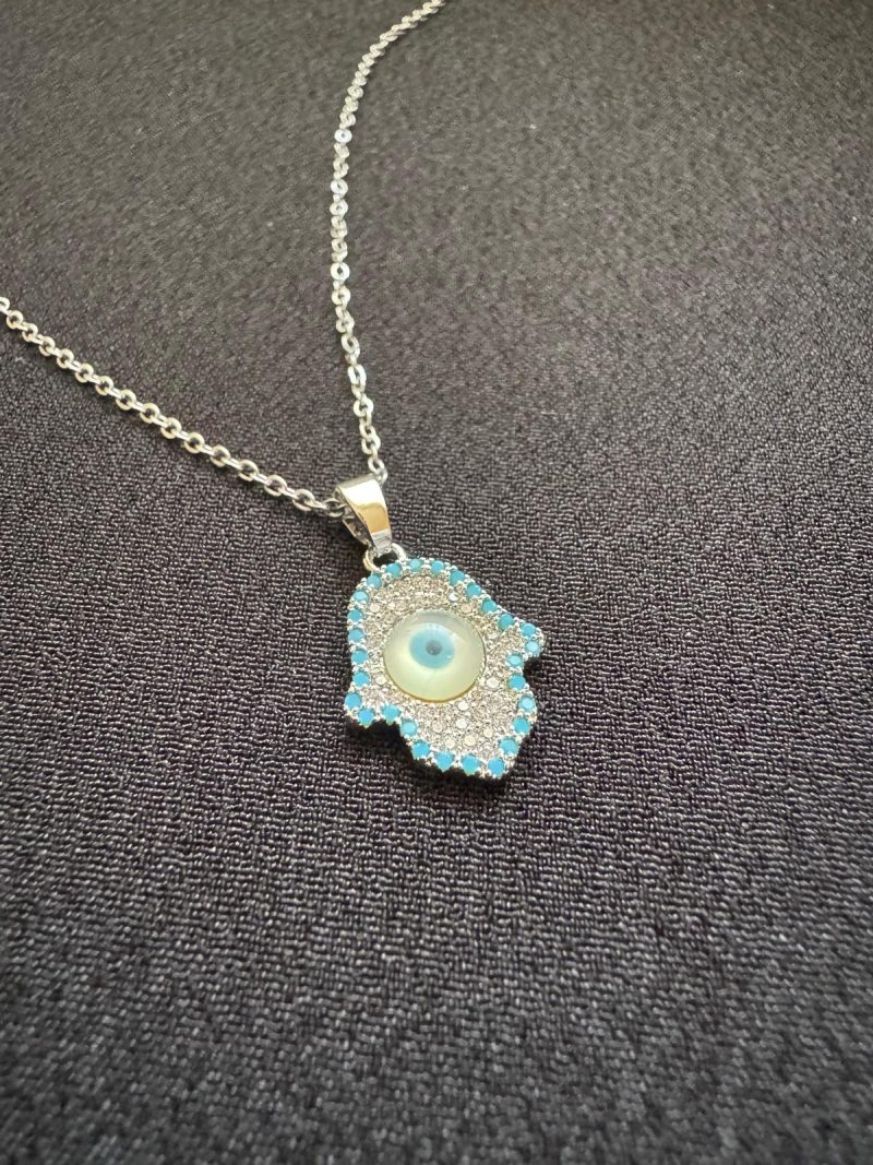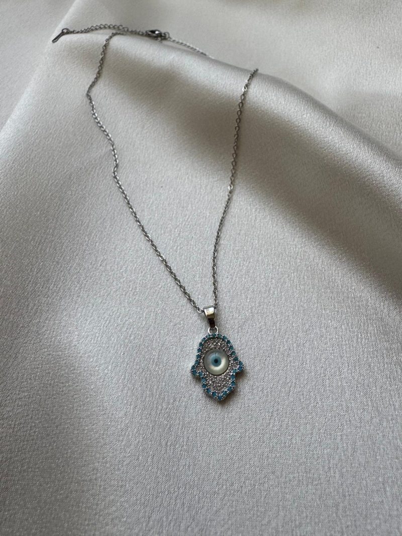 Geleneksel sembolleri modern bir yorumla buluşturan bu özel tasarım, hem ruhunu hem tarzını yansıtacak! Hamsa (Fatma’nın Eli) figürünün merkezine yerleştirilen nazar göz motifi, kötü enerjilere karşı koruma sağlarken, çevresini saran parlak zirkon taşlar kolyeye ışıltılı ve şık bir dokunuş katıyor.