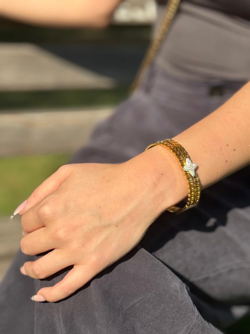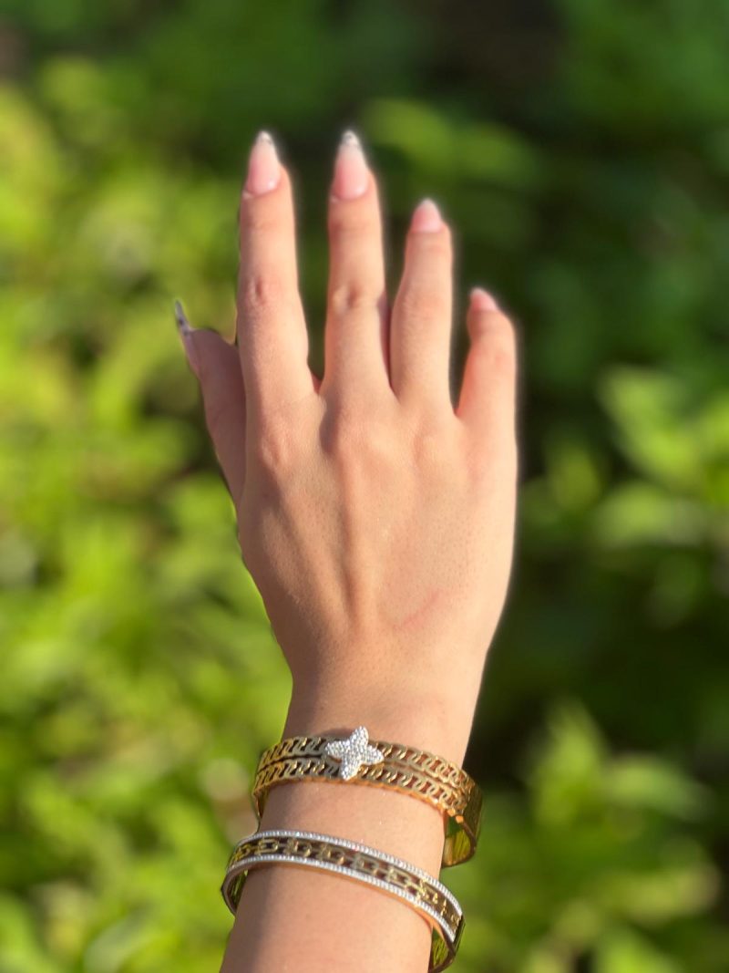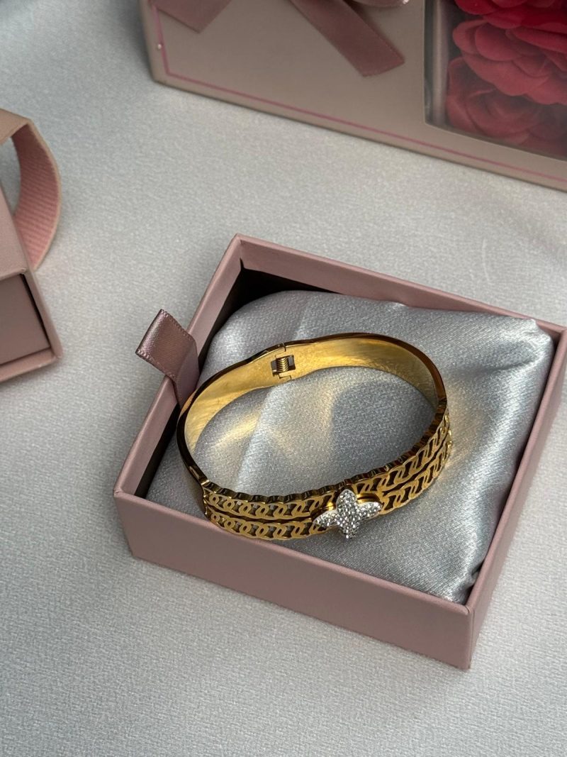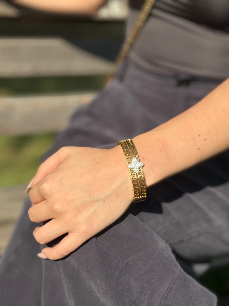Zincir görünümlü detaylar ve ortasında parıltılı taşlarla bezenmiş yıldız figürüyle tasarlanan bu altın renk kelepçe bileklik, hem modern hem zarif bir stil sunar. Paslanmaz çelik yapısı sayesinde kararma yapmaz, su ve parfüme karşı dayanıklıdır. Tok yapısı bileğe tam oturur. Işıltıdan vazgeçemeyenler için hem şık hem kullanışlı bir parça.