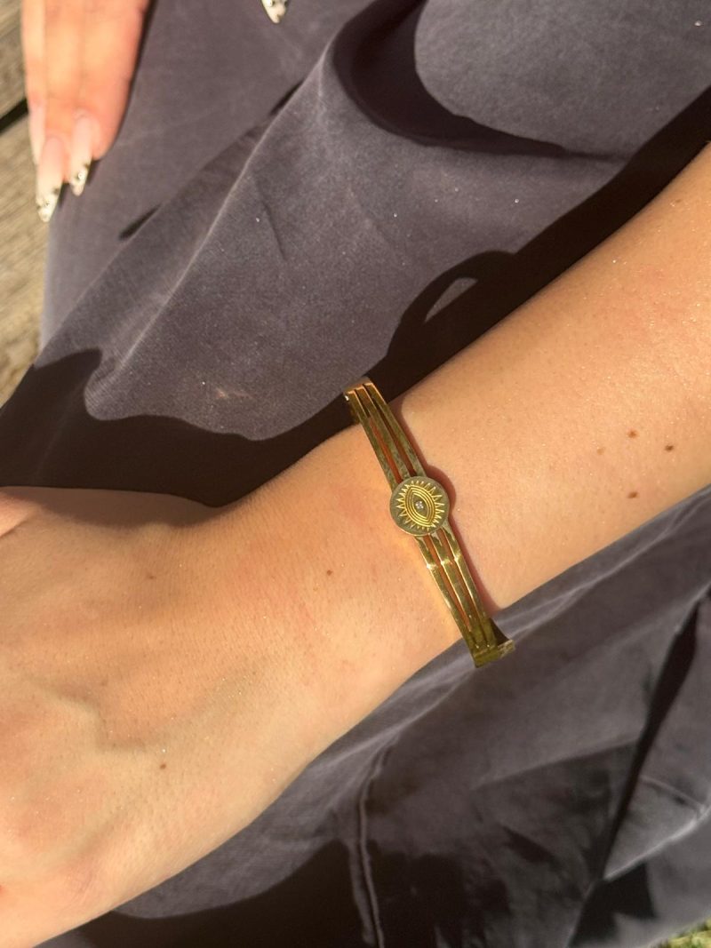 Üçüncü göz sembolü, içgörü ve sezgiyi temsil eder. Bu altın tonlu çelik bileklik, minimalist çizgilerle güçlü bir anlam taşır. Kararma yapmayan paslanmaz çelik yapısıyla uzun ömürlü ve konforlu kullanım sunar. Hem günlük stilinize hem de özel anlarınıza eşlik edecek özel bir parça.